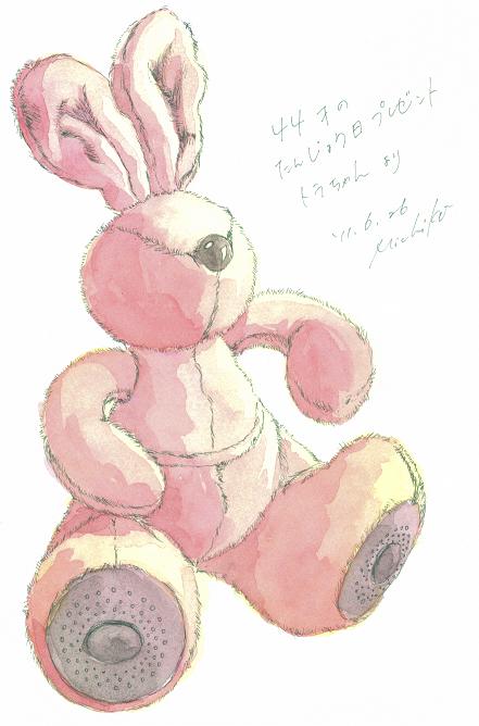 絵は、今年の私の誕生日に夫がくれたRabbit。音楽プレーヤーを、おなかのポケットに入れると、足の裏のスピーカーから音が出る、というぬいぐるみ。本当はもっとどぎついピンクなのだけれど、夫がくれたものなので、あえて、優しい色にしてみた。
