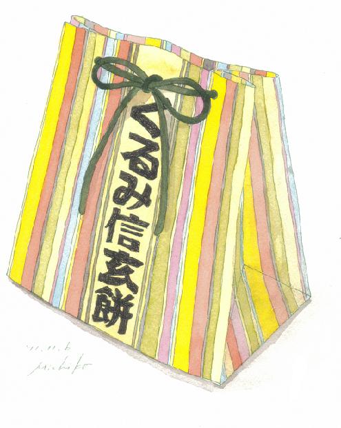 代わりといってはなんだが、姉が持ってきてくれた信玄餅のパッケージを。和風なのだが、どこかモダンで、ヨーロッパの香りもしなくもない。武田信玄はこれ、食べたんだろうか?日本史に詳しい夫に聞いてみたが、「それはどうだろうなあ・・・黒蜜がまだなかっただろうから。ほうとうは食べたんじゃないかな」と。たしかに、あのずんぐりした無骨な武将が、このかわいらしいおもちに黒蜜をかけている絵を想像するのは難しい。