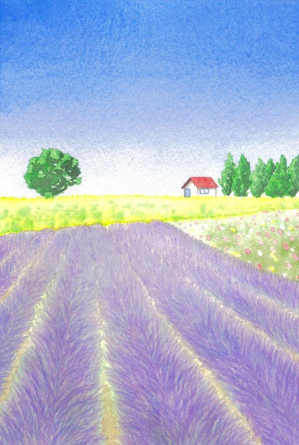 きのう描いたのは、北海道の夏の風景。ラベンダーの色としっくりくる絵の具がどうしても見つからない。で、じーっとその写真を見ていたら、「青か!」と気が付き、紫色の上に薄くしたウルトラマリンブルーを重ねたら、ラベンダーの色に近づいた。こうなればしめたもので、あとは根気よく一本一本、細い筆で描いていくだけだ。しかしこの方法は、水彩だと、下の色が落ちやすいので、今回はラベンダーの部分だけ、アクリル絵の具を使用した。動物の毛や、それを模したぬいぐるみの毛の感じを出すのにもこの画法を使うことが多い。栗のイガもそう。手間さえ惜しまなければ、大抵のことは理想の方向に近づく。