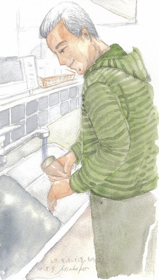 昼は夫のお得意の野菜たっぷりの焼きそばだった。私は、朝のうちに携帯で撮っておいた夫の珍しい姿を水彩画にしながら、お昼を待っていた。狭いキッチンで、でかい夫と、身長がほぼ私と変わらない娘たち3人が並ぶ。なかなか見られない光景だ。
