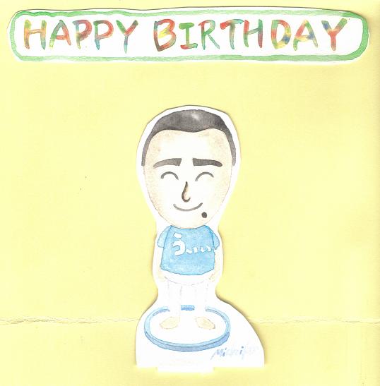 昨日は二女が部活で帰宅が夜8時近くなるということで、夕方のんびりカードを作った。朝のうちに、名刺大のカードを子供たちそれぞれに渡して、「最後に一つにまとめるので、メッセージ書いといて」と頼み、私は、水彩紙に彼の「Wii」のキャラクターを描いて切り抜き、開くと飛び出すように色紙に貼り付けた。