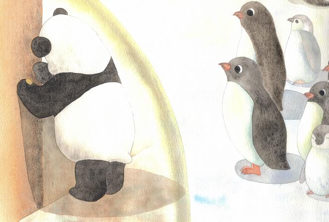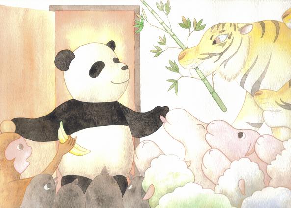 さて、きょうの絵。友達を作ることの難しさを痛感してふせっていたパンダ君の元に、心配した動物たちが集ってきました。「友達になりたい」と思う気持ちと、パンダ君の勇気ある行動があって、いつの間にか、仲間ができていたんですね。おしまい。