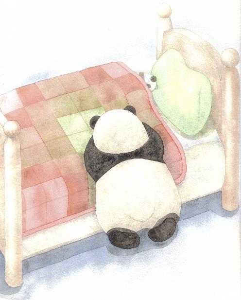さてきょうの絵。パンダくんは、家にとじこもり、ベットにつっぷしてずっと泣いています。「友達を作るのって、すごく難しい・・・」