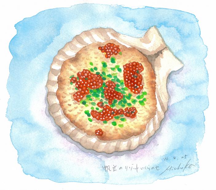 そのおすし屋さんで、帆立貝を焼いたものをいただいたのだが、その殻を職人さんが下げて、「ごはん入れてきますね」と。暫く待って出てきたのは、なんと、その残りのスープに白いご飯を足して作ったリゾット?だった(たまごでとじていれば雑炊か?)。私が大のいくら好きと知っていてか、たっぷりのいくらが乗っていた。私はホタテもいくらも大好きなので、これには感動した。家でもよく殻つきのホタテをバターとしょうゆで焼いていただくが、このリゾットは思い付かなかったな~。次から家でもやってみよう。いくらには手が届かないと思うけれど、仕上げにあさつきをパラリとかければちょっと粋な〆のごはんになる。