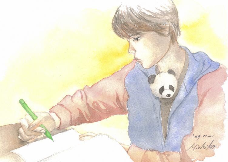 今日の絵は、勉強する次女。襟から顔をだしているのは、彼女の大切なパンだのくーちゃん。デビューだ。