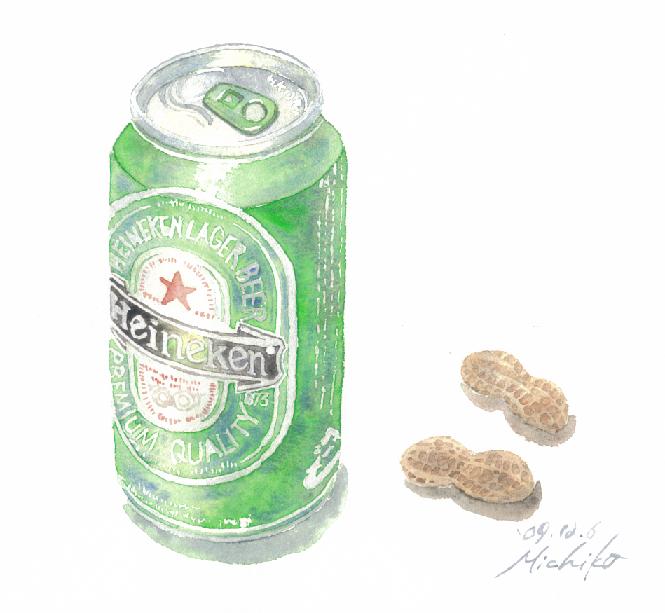 今日描いたのは、10年以上も前に絵のモチーフにしようと買って置いてあったビール。金曜日もこれを飲んだ。そして、先週、母が送ってくれた、母が育てて父が煎ってくれた落花生。頭痛は昨日ですっかりひいたので、今夜はまったりと、そしてワイワイと鉄板を囲み、お好み焼きで家飲み。