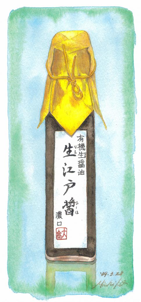 今回の絵は、ちょっと上品なしょうゆの瓶。ホワイトデーにある男性からいただいたもの。その方は、他の女性たちにも同じものを配ったらしいが、辛党の私には嬉しい贈り物だ。もったいないので煮物などには使わず、玉子かけご飯やお刺身などを頂くときにだけ、ちょっとずつ使っている。実はもう、3分の2ほどは頂いちゃった。あまりにおいしいので、なくならないうちに、描いておくことにした。