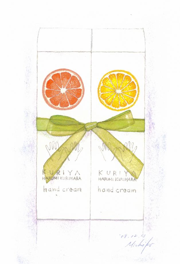 木曜日、私宛に荷物が届いた。「かあちゃんあてに、出版社から荷物が来ているけれど、開けていい?」と、次女からメールがあったので、開けて貰ったら、栗原はるみさんがプロデュースするブランド「KURIYA」のハンドクリーム(オレンジとグレープフルーツの香りのセット)だった。創刊から欠かさず買っている雑誌「haru_mi」創刊2周年記念の懸賞の賞品。自分で買うのはちょっと贅沢なお値段。ちょうど手持ちのハンドクリームが切れるところだったので、ありがたい。「パッケージ、かわいい!」と長女。ということで、今回は記念にこれを描いて見た。今年は、いいことがあまりなかったけれど、最後に来た、嬉しいクリスマス・プレゼントだ。