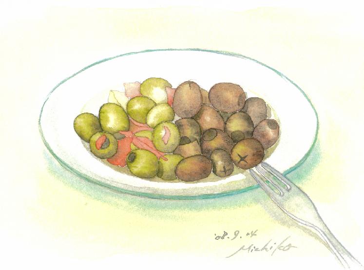 今日の絵は、デパ地下で買ったオリーブ。これから娘たちと夜さんぽにいき、帰ったら、これで一杯・・・。寝酒は、休日の前だけは許されているのだ。ハッハッハッ。