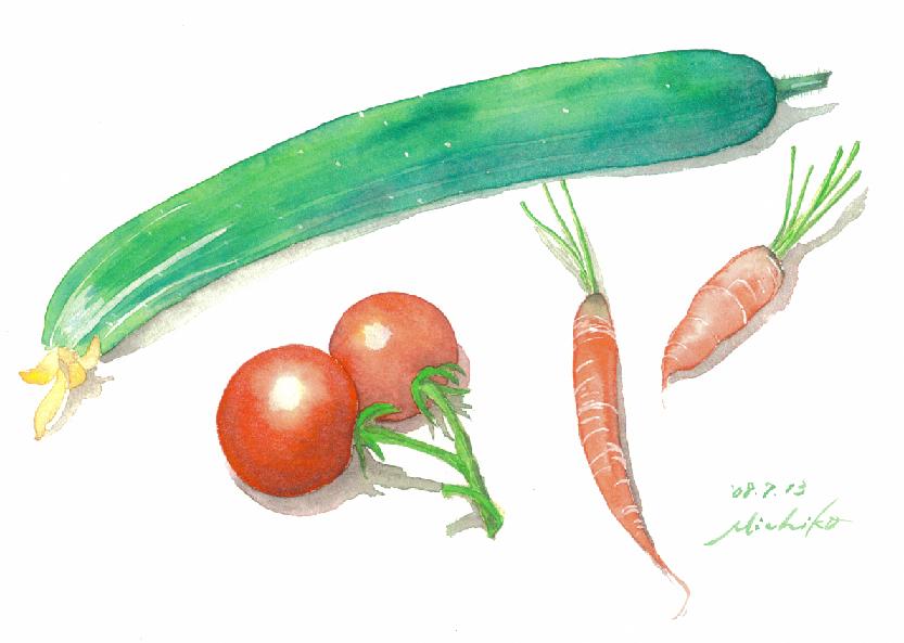 今日は、我が家でとれた野菜を描いてみた。ベビーキャロットは、まるごと衣をつけててんぷらにして、お昼にそうめんと一緒にいただいた。きゅうりとトマトは、これから、サラダにして夕食のテーブルに出そうと思う。