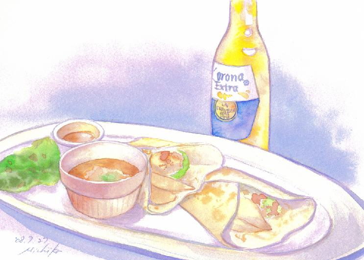 友人の展覧会の打ち上げを、ふたりきりで、少し早めに地元のメキシカンレストランで開いた。絵は、そのときに頼んだチキンファフィータとコロナ。翌月曜日の朝、彼女を羽田で見送った。慌しくも、ひとりではとても体験できなかったであろう、刺激的で収穫の多い連休だった。