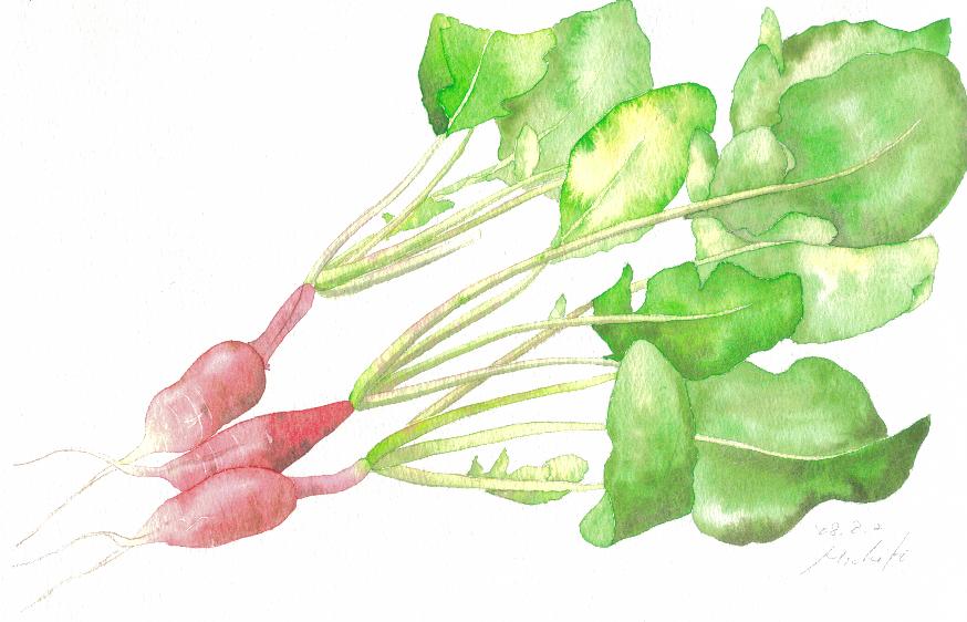 きょうの絵は、昨日の朝、収穫したはつか大根。単独で食べると辛いけれど、スライスして水にさらし、サラダにすると、ちょうどいい。