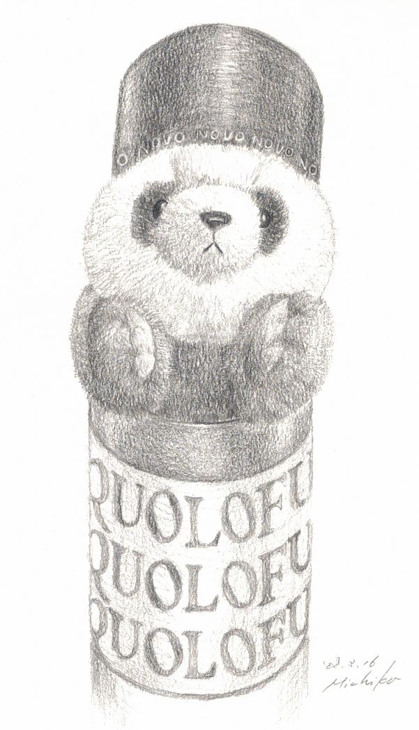 今日は、次女のリクエストで、彼女のコレクションの中から「Uー」(ウー)ちゃんを選び、ホワイトデーにいただいた「QUOLOFUNE」(チョコレート菓子)のパッケージに入れて描いてみた。水彩はちょっと飽きてきたので、鉛筆のみで。耳が、ちょうどフタで隠れて、中国っぽい感じになった。