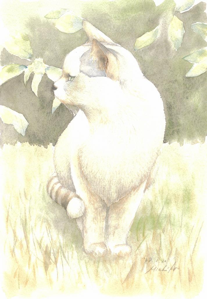 私たちの陣地から約2メートルほど離れたところに、全体が白く、しっぽが白とこげ茶色の縞で、グレーの瞳をした不思議な猫がいた。えさをせがむわけでもなく、近寄っていっても逃げることはないのに、触ろうとするとすかさず“猫パンチ”をしてくる。そのくせ、私が歩いて移動しようとすると、どこまででもついてくる。立ち止まってまた触ろうとすると、“うにゃ~”とうなってまた猫パンチ! おもしろいので、写真や動画に収めておいた。