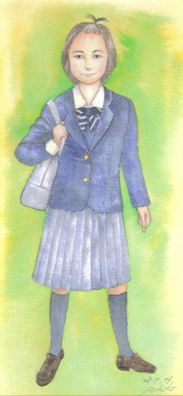 4/8の火曜日は、長女の高校の入学式だった。東京は嵐だった。それでも入学式。お日様は見えなくても、やはり新しい制服に身を包んだ長女は希望に満ち溢れていて、眩しかった。初めてのブレザー、初めてのローファー・・・きちんと絵にして、記録しておこう。