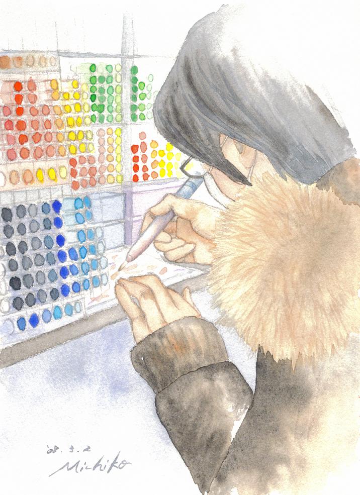 今日の絵は、世界堂で真剣にカラーマーカーの試し描きをしていた長女。花粉症なので、マスクをしている。これを見て、「指の形がきれいに描けてるね」と、めずらしく褒めてくれた。入試を無事に終えて、母親を気遣う余裕も生まれたようだ。