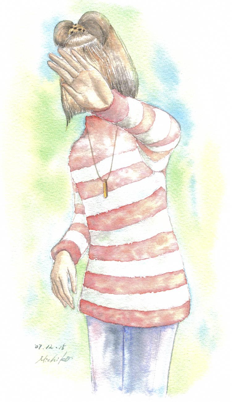 今日は、いやがる次女の写真を撮ったところ、ちょっとおもしろいポーズだったのでそのまま描いてみた。セーターは本当は白黒なのだが、絵として面白くないので、私の好きな赤白に変えてみた。なんだか、売れっ子アイドルみたい!