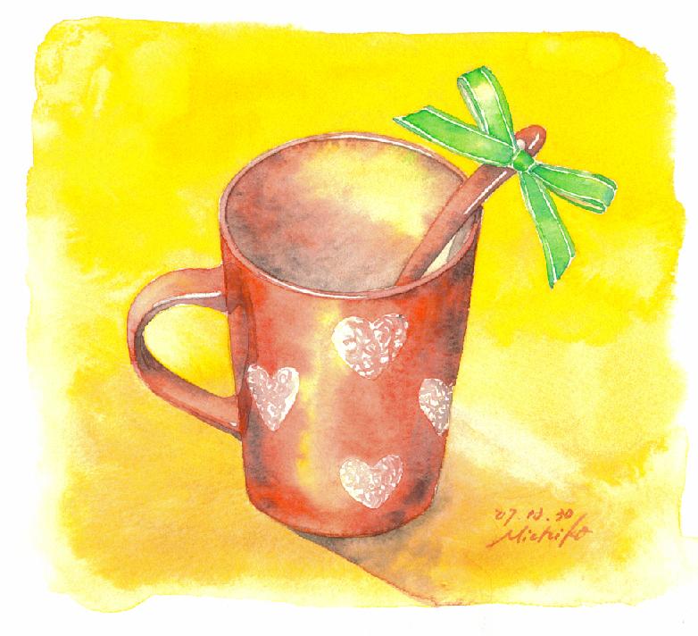 イラストは、次女にもらったマグカップとスプーン。色のバランスが悪いので、グリーンのリボンをつけてみた。