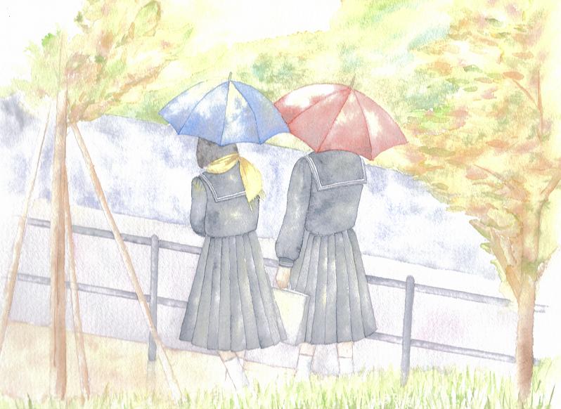 今日の水彩画は、文化祭の朝、裏の窓から見送った姉妹の後姿を描いたもの。最近、娘たちを見送るこの時間が、一日でもっとも幸せだ、と感じる。