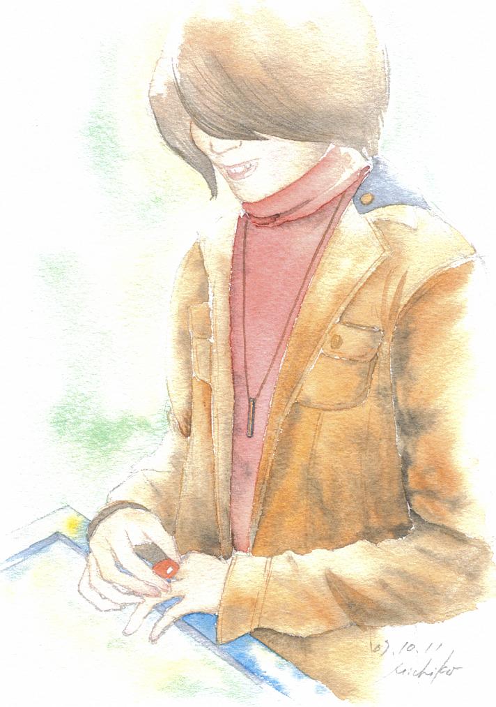 今日の絵は、長女の昨年度の担任でもあったそのW先生。「先生の髪は、灰色なんだよ。ごましおでフサフサ。私、いつも一番前の席だったから、じーっと観察してた」と長女。学生の頃、音楽の道に進むか、絵の道に行くか、と迷われたというだけあって、着るもののセンスがいい。
