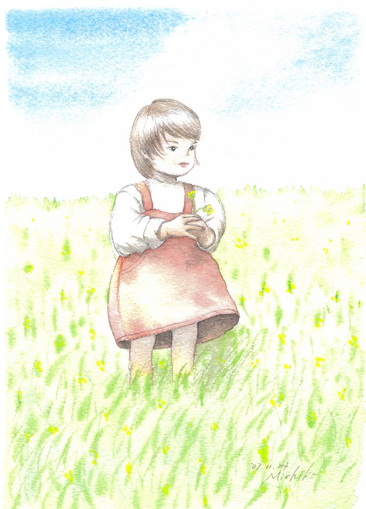 幸い我が家には、娘たちの小さな頃に撮りまくったかわいい写真がたくさん眠っている。この絵は、実家の近くの利根川の土手で、次女が花を摘んでいるのを、下のほうから撮った写真から起こしてみたもの。ちょっと美人に描きすぎているのは、キャラ研究と、親ばかのためである。