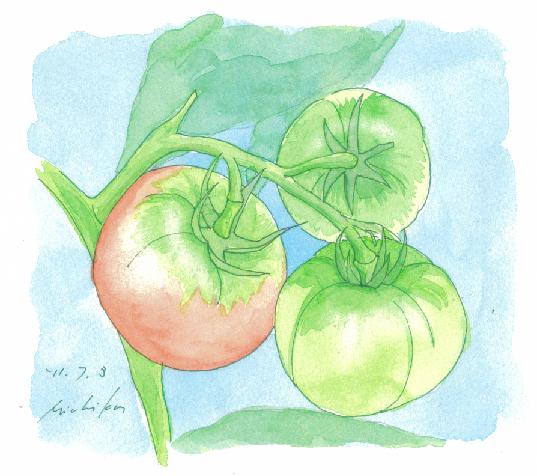 ベランダで育てているトマトが、やっと、1個だけ、赤く色づき始めた。