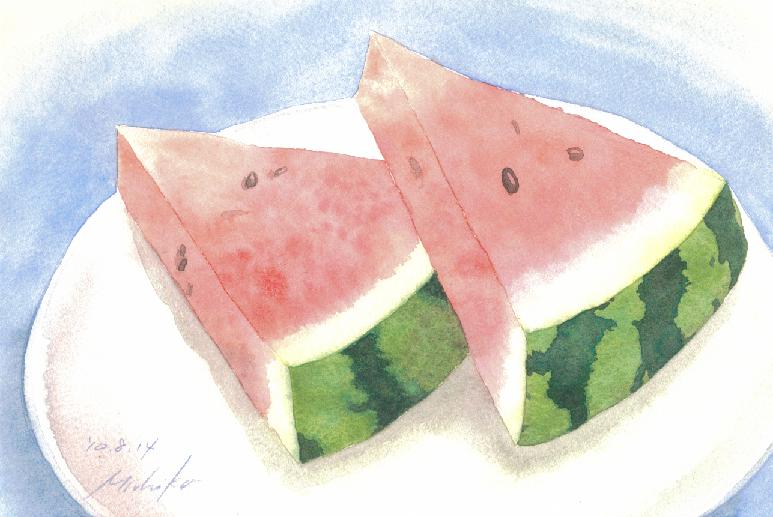 「そういえば、この夏はスイカを食べてないね~」という二女の言葉で、きょうはスイカを買ってみた。食べるのは夕食の後だけれど、時間があるので、先に描くことにした。