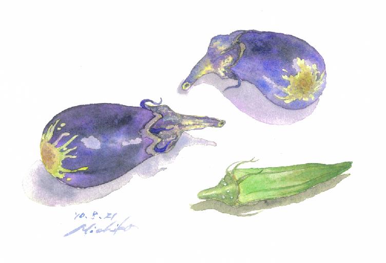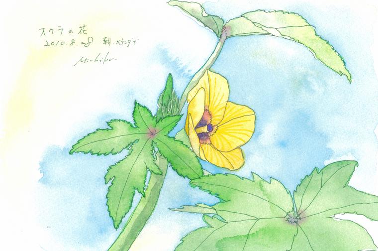 そんな中、先週に引き続き、オクラとなすは元気いっぱいだ。オクラは、うすい黄色の可憐な花を咲かせる。朝、ベランダがまだ日陰になっている涼しいうちに、それを鉛筆でスケッチし、携帯のカメラで写真を撮っておいた。一通りの家事を終えた午後に、ベランダに面した部屋にある机で、彩色。花の細かい部分を確認しようと、ベランダに出てみたが、花はすっかり閉じてしまい、実になる準備に入っていた。注意深く見ると、葉っぱも形を変えている。成長が早い。仕方なく、一部は、撮っておいた写真で確認して仕上げた。