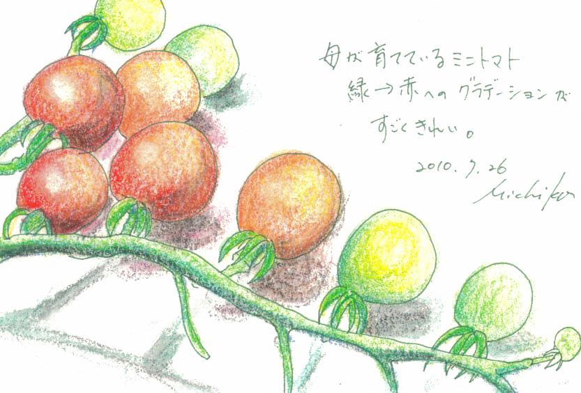 朝食と掃除を終えてから、またわんこの散歩。母の育てている夏野菜たちを携帯のカメラでいっぱい撮った。立派な鈴生りのミニトマトを、この日記の挿絵用にいただき、帰ってからペンと水彩色鉛筆で簡単にスケッチした。