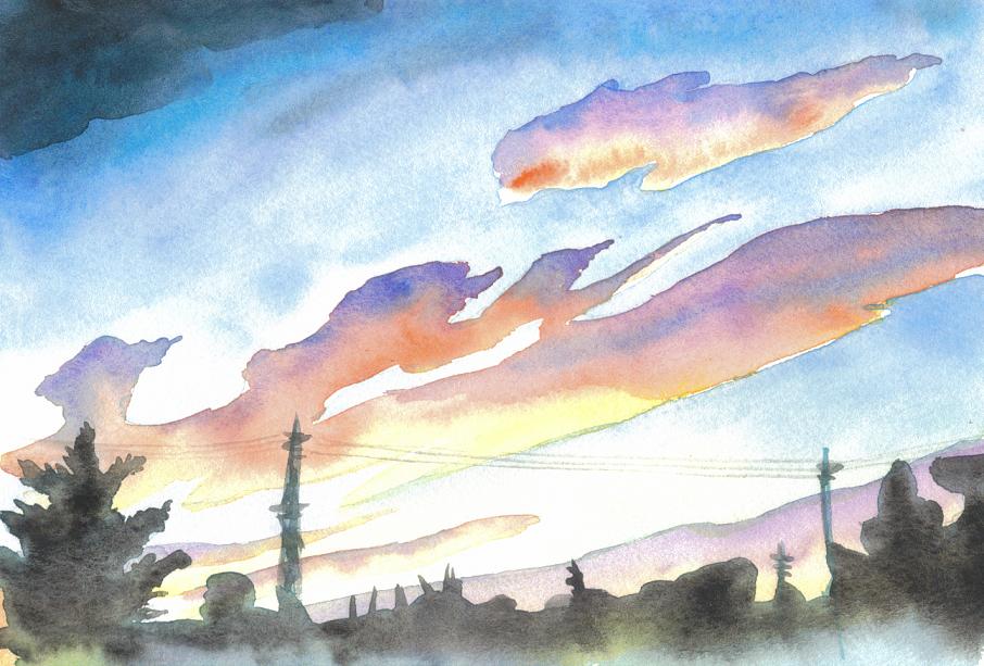今週のある朝、外を見たら見事な朝焼けだったので、携帯のカメラで撮影しておいた。絵では恐らく5割ぐらいしかその美しさを表現できていないと思う。さて、絵本コンクールの、次の応募テーマを考えなくちゃ!!