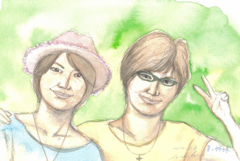きょうの絵は、うちの姉妹。ふたりでおめかしして出かけようとしたところを、義母が写真に残してくれたので描いてみた。
