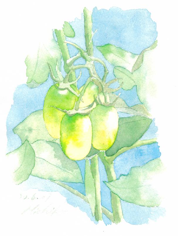 今年のトマトはイタリアンミニトマトだ。順調に実をつけているが、まだ青い。二女は、ミニトマトをスライスしたものをチーズと一緒に焼いて食べるトーストが大好きで、このイタリアンミニトマトも、彼女が選んだ。